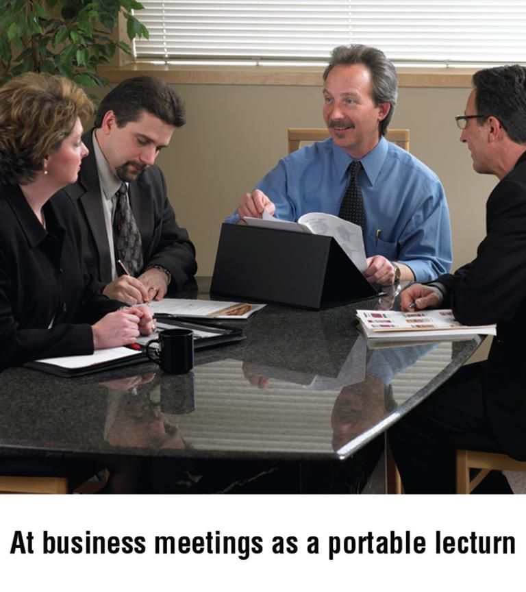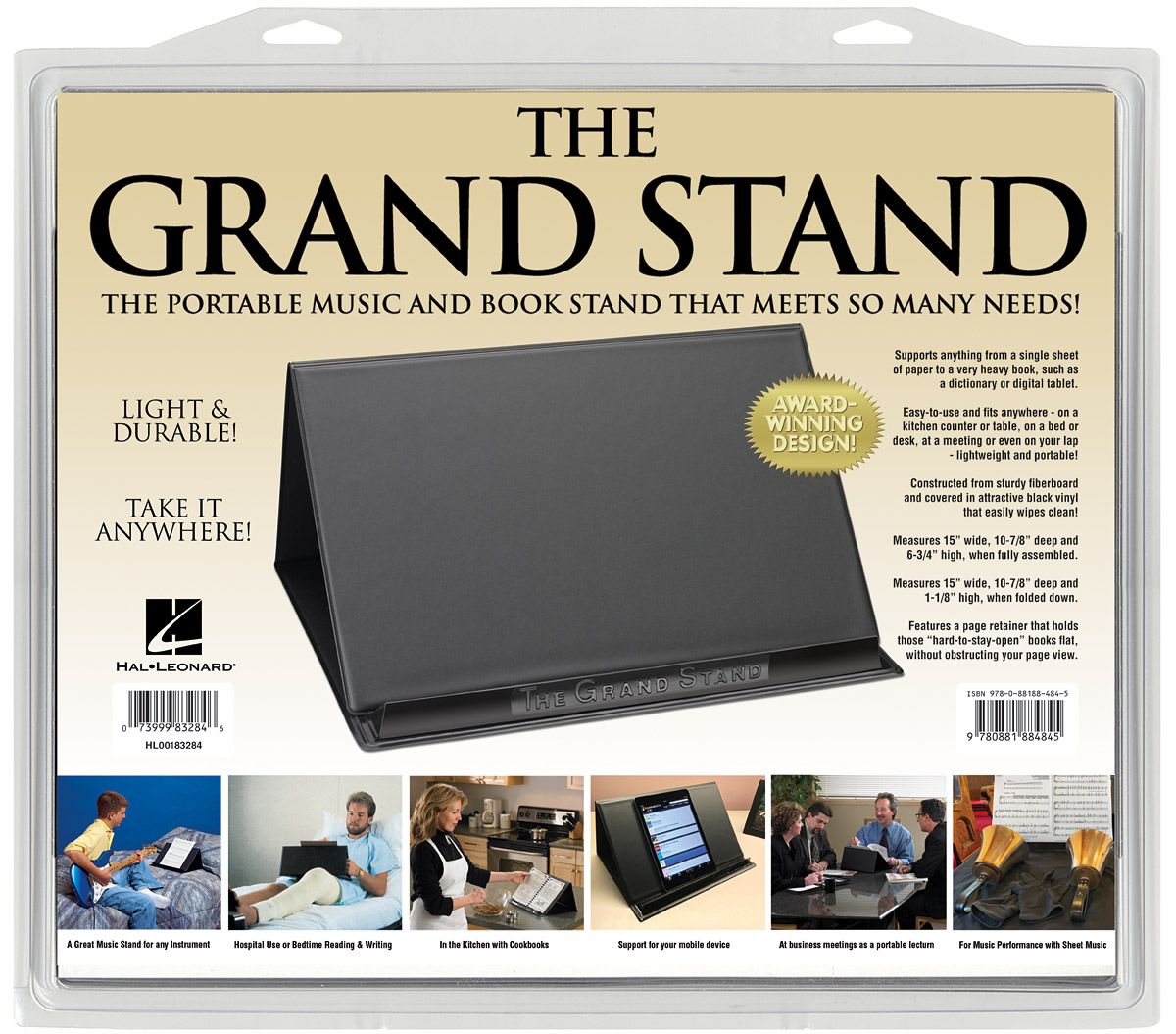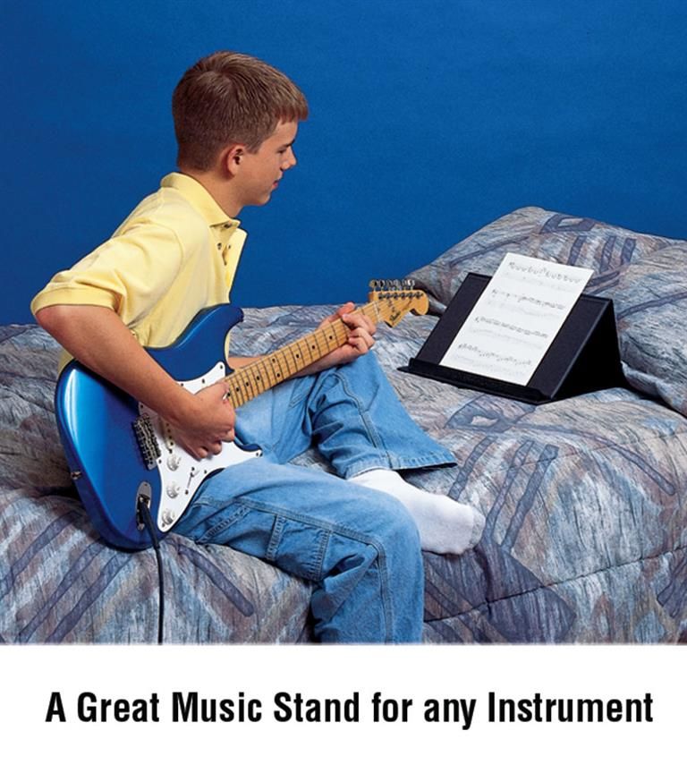 Light and durable so you can take it anywhere, The Grand Stand is the portable music and book stand that meets a variety of needs. Now available in new, convenient packaging, The Grand Stand is constructed from sturdy fiberboard, covered in attractive black vinyl that easily wipes clean. It measures 15 wide x 10-7/8 deep and 6-3/4 high when fully assembled; and folds down to be only 1-1/8 high. It's easy to use and fits anywhere - on a kitchen counter or table, on a bed or desk, at a meeting or even on your lap. The Grand Stand supports anything from a single sheet of paper to a very heavy book, and features a page retainer that holds those hard-to-stay-open books flat, without obstructing your view of the page.